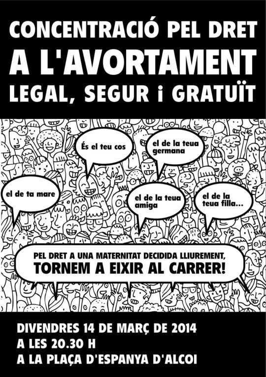 La Manifestació contra la llei de l’avortament de Gallardon a la plaça d’Alcoi ha reunit molts ciutadans, després s’ha llegit un manifest. En declaracions que feia Anna Serrano: “L’avantprojecte de Llei de l’actual govern és una clara regressió respecte a la legislació vigent, és més ideològic que social, i perjudica molt més a les famílies amb pocs recursos.”