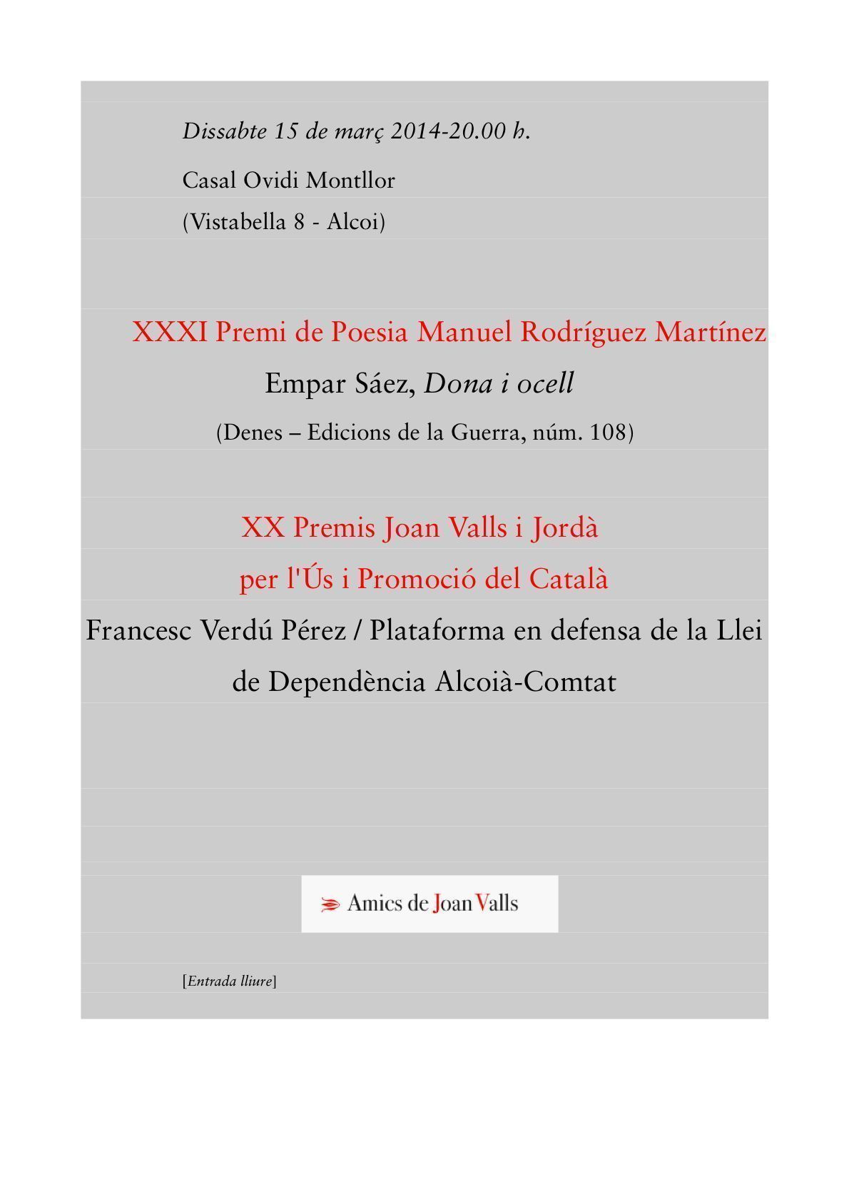 Els premiats rebran els seus guardons –una escultura obra d’Antoni Miró– en un acte públic que Amics de Joan Valls al Casal Ovidi Montllor de la nostra ciutat a aquest dissabte 15 de març, a les 20.00 h., on també es farà públic el XXXIè Premi de Poesia Manuel Rodríguez Martínez – Ciutat d’Alcoi a la poeta de Terrassa Empar Sáez pel seu llibre Dona i ocell, publicat per l’Editorial Denes.