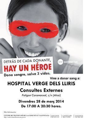 Divendres 28 i dilluns 31 de Març, Alcoi torna a tindre una important cita en la donació de sang, esta vegada a l’Hospital Verge dels Lliris i en el Centre de Salut la Fàbrica, de 17,00 a 20’30 hores, respectivament. Tots els ciutadans que vulguen poden acudir, la campanya organitzada per al Centre de Transfusions de la Comunitat Valenciana, baix el eslògan: Darrere de cada donant “Hi ha un heroi, dona sang salva 3 vides”.