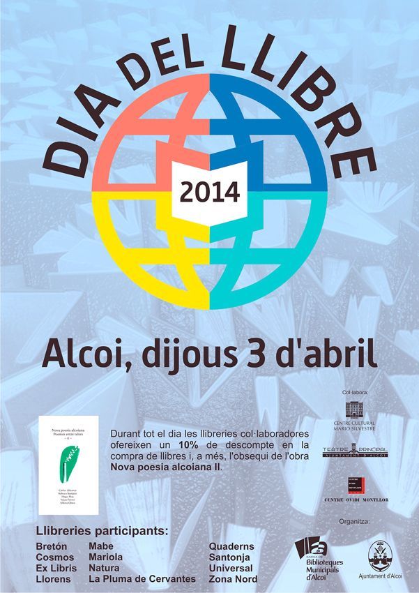 El dijous 3 d’abril se celebra a Alcoi el Dia del Llibre, organitzat per la Xarxa Municipal de Biblioteques amb la col·laboració de la Regidoria de Política Lingüística, el Casal Ovidi Montllor, el Teatre Principal, i que enguany compta amb la col·laboració de dotze llibreries de la ciutat.