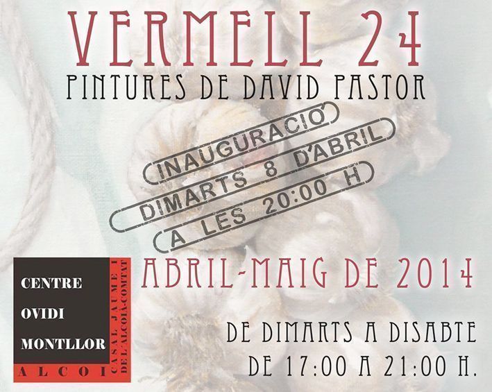 David Pastor Corbí (Alcoi 1971) us convida i presenta l’exposició “Vermell 24” al centre cultural Ovidi Montllor d’Alcoi el dimarts 8 d’Abril tindrà lloc la inauguració a les 20 hores i fins al 30 de maig es podrà visitar aquesta mostra de pintures, lustracions, dibuixos i esbossos preparatoris amb l’horari habitual de Dimarts a Dissabte de 17:00 a 21:00 h.