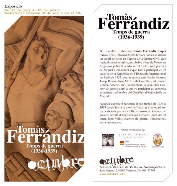 Hui 20 de juny el Cente Cultural Octubre s'inaugura aquesta exposició dedicada a l'escultor i dibuixant alcoià Tomàs Ferrándiz Llopis (Alcoi 1914-Madrid 2010). La mostra, que al mes de Maig va ser inaugurada a Alcoi viatja a València,