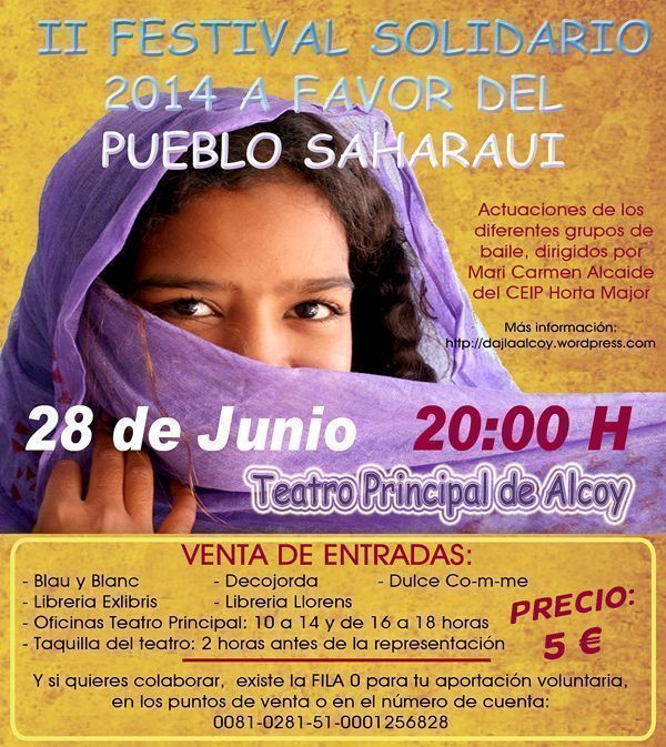 Dissabte que ve 28 de juny, tindrà lloc l’II Festival solidari amb el Sàhara, amb finalitat de recaptar fons econòmics, es presenta aquesta iniciativa solidària que consisteix en una sèrie d’actuacions de ball, protagonitzades per alumnes i alumnes del Col·legi Publico Horta Major amb edats a partir dels 3 anys, els quals són coordinats per Carmen Alcaide, professora de ball modern del Club esportiu Horta Major, i membre destacat de l’associació DAJLA.