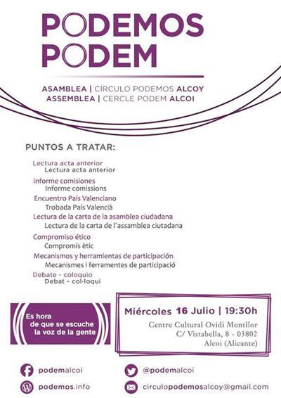 Al mateix temps, convidar a tots els ciutadans a assistir a l'assemblea quinzenal, que tindrà lloc dimecres que ve, dia 16 de Julio, a partir de les 19,30 hores, en centre cultural Ovidi Montllor.