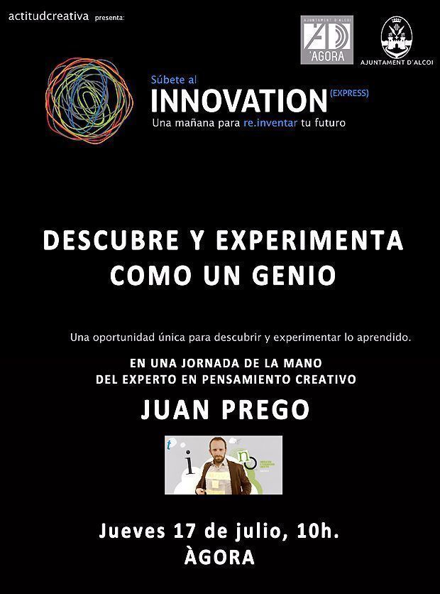 Per altra part, l’Ajuntament d’Alcoi ens convida, també a l’Àgora, a pujar-se al tren de l”Innovation (Express)’, de la mà de l’expert en pensament creatiu Juan Prego, i presentat pel segell actitudcreativa. El dijous a les 10 del matí, Prego parlarà de les eines per a reinventar el futur sota el següent lema: “Descobreix i experimenta com un geni”.