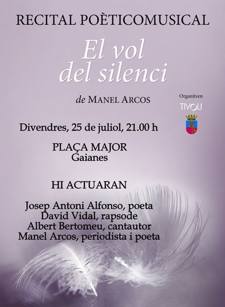 El divendres 25 de juliol, a partir de les 21.00 h, el silenci poètic planarà per sobre la plaça Major de Gaianes. A l’escenari de la plaça Major seran també el rapsode David Vidal, el poeta Josep Antoni Alfonso, el cantautor Albert Bertomeu i un grup de recitadors a descobrir. Acosta’t a Gaianes i hi participa.