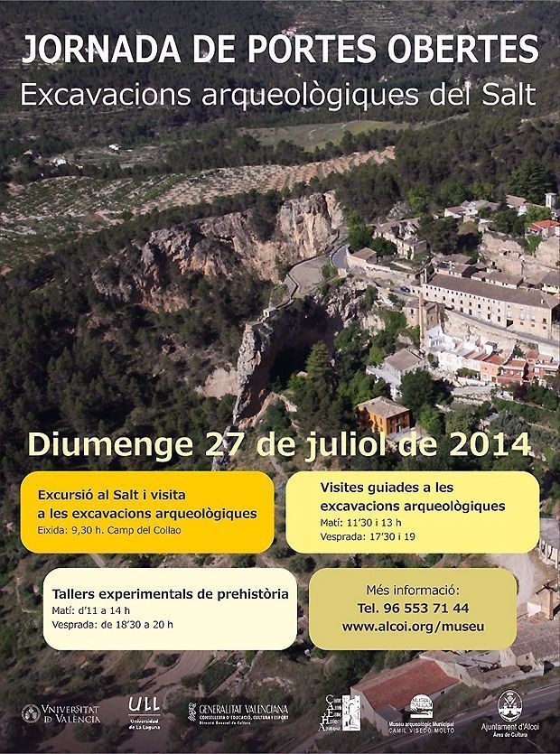 Aquest diumenge dia 27 de juliol se celebra la jornada de portes obertes a les excavacions arqueològiques del Salt, amb eixida a les 9.30h. des del Camp del Collao d’Alcoi. A banda de les visites guiades (matí a les 11.30 i la 13h., i vesprada 17.30 i 19 h.), es duran a terme uns tallers experimentals de prehistòria. Dins el cicle ’10 excursions voltant Alcoi i el seu patrimoni històric’.
