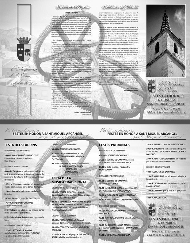 El cartell de festes de la l’Alqueria d’Asnar ocupa ni mes ni menys que els quatre caps de setmana del mes de setembre. «Està tot el poble revolicat», ens comenta amb il·lusió i simpatia la regidora de cultura i festes de l’ajuntament de l’Alquería d’Asnar, Teresa Quilis Blasco. Tot el poble té alguna cosa que preparar: els vestits i disfresses per a les desfilades i processons, els concerts musicals, els jocs i teatres per a xiquets, la fira gastronòmica i artesana, les exposicions fotogràfiques i culturals, els esdeveniments gastronòmic, el concursos…