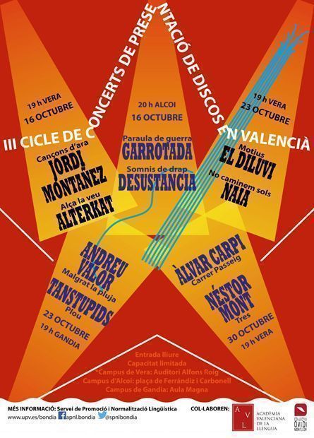 La Universitat Politècnica de València (UPV), a través del Servei de Promoció i Normalització Lingüística, ha organitzat el III Cicle de Concerts de Presentació de Discos en Valencià amb l’objectiu de promoure la música en la nostra llengua i donar suport a molts grups valencians.
