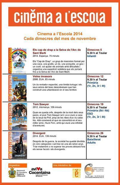 Cinema a l’Escola és un projecte dirigit a tots els centres educatius de Cocentaina i de la comarca del Comtat. Així, cada dimecres del mes de novembre tots aquells amants del cinema o que únicament vulguen passar una bona estona podran acudir a veure diferents films en la nostra llengua.