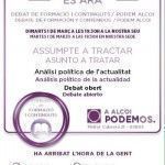 Finalment, després de la lectura de la part del document polític aprovat en l’Assemblea General que explica per què els Cercles Podem locals no han de presentar-se als següents comicis municipals i per què seria convenient que recolzaren candidatures obertes ciutadanes, es va donar lloc a un debat.