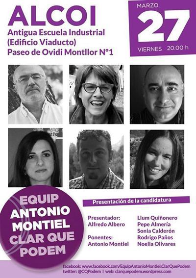 Clar que Podem equip Antonio Montiel en l’Antiga Escola Industrial (Edifici Viaducte) a les 20:00h. divendres 27 de març • Aprofitem per a recordar que el procés de votacions a les primàries obertes comença el dimecres 25 i acabarà el 29