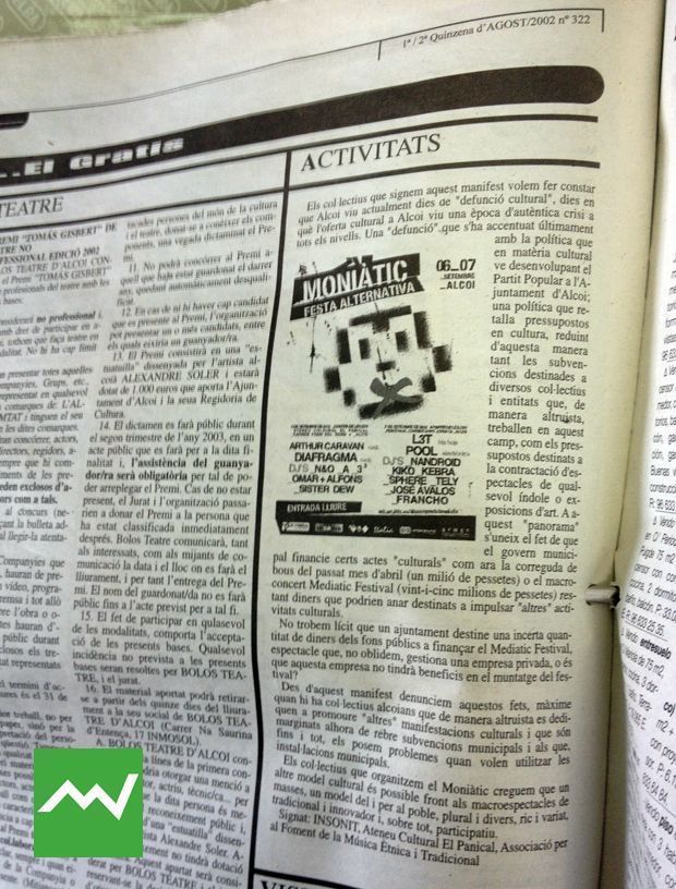 El Moniàtic Festival, és a dir, el festival de cultura, art, música i teatre independent i alternatiu d’Alcoi va nàixer a començament de segle com a resposta a les desmesurades despeses del famós –però fracasat– Mediàtic Festival. Allò que va nàixer com una reivindicació de la cultura i l’art alternatiu alcoià va esdevindre, si més no, una empenta ben significativa del món cultural alternatiu i underground d’Alcoi. Aquests estils de música, d’art, de cultura i de vida. És el món alternatiu, la cultura del mínim pressupost i de la resposta cada vegada més nombrosa.