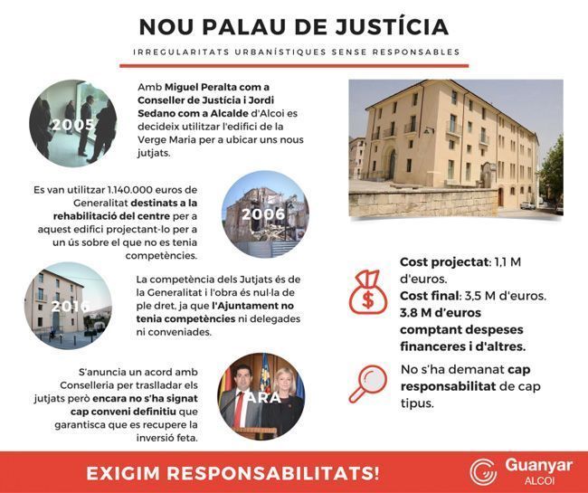 Cal afegir que en febrer del 2016 es va anunciar que el trasllat dels Jutjats d’Alcoi es realitzarien entre maig i juny. En setembre Guanyar Alcoi ja va denunciar públicament els incompliments del Govern amb els terminis. I durant aquests dies “de nou, anuncien que el trasllat es realitzarà l’any que ve”.