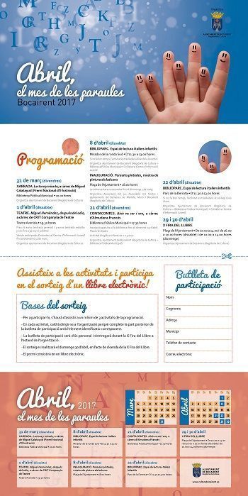 La doble sessió de l’espai de lectura i de tallers infantils ‘Biblioparc’ (el dia 8 al mirador de la ronda Sud i el 22 al parc de la Derrota) o la presència de la rondallaire Almudena Francés a la biblioteca pública municipal amb ‘Això va ser i era’ el dia 21 completen ‘Abril, el mes de les paraules’. La iniciativa de la Regidoria de Cultura de Bocairent incentivarà la participació en les diferents activitats amb el sorteig d’un llibre electrònic entre els assistents a, com a mínim, tres de les propostes.