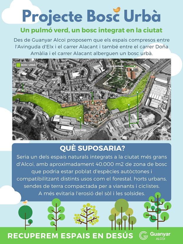 Guanyar Alcoi proposa la creació d’un Bosc urbà amb l’objectiu de recuperar espais en desús o degrats i donar-los ús i utilitat per a tota la ciutadania. En concret el Bosc Urbà s’ubicaria en els espais compresos entre l’Avinguda d’Elx i el carrer Alacant i també entre el carrer Doña Amàlia i el carrer Alacant alberguen. Així ho ha proposat tant a les al·legacions del PGE com al Projecte de regeneració dels espais industrials d’Alcoi.