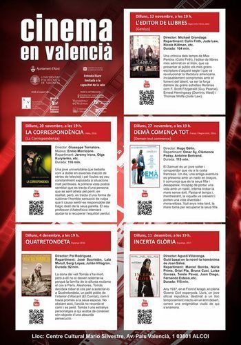 • El cicle de Cinema en Valencià 2017 a Alcoi es desenvoluparà des del 13 de novembre a l’11 de desembre • Es projectaran les pel·lícules L’editor de llibres, La Correspondència, Demà comença tot, Quatretondeta i Incerta glòria.