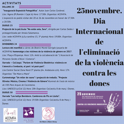 Per al divendres 24, es llegirà un manifest a càrrec de Beatriz Muntó Garrigós (usuària d’ACOVIFA) i es retrà un homenatge a les víctimes de la violència de gènere en 2017; tot açò a les 12 h en la Plaça de Dins amb la col·laboració de “l’Associació de Persones Sordes d’Alcoi i Comarca”.