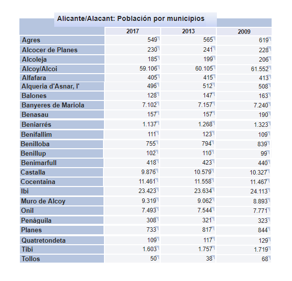 Continua la baixada de la població de l’Alcoià i El Comtat. Les xifres de l’Institut Nacional d’Estadística són clares al respecte: la despoblació està afectant notablement a pobles i ciutats, que veuen com el seu cens de residents cau any rere any, des del començ de la crisi econòmica, en 2008, fins al dia d’avui.