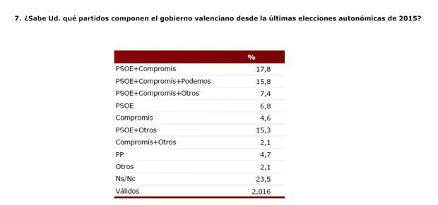 Un 23% de la població valenciana no ha volgut contestar a la pregunta de qui és el Govern actual del País Valencià. I tan sols un 17,8% encerta que la Generalitat està governada pel PSOE i Compromís. Un 15,8% pensa que Podem està dins del govern junt amb PSOE i Compromís. Un 4,7% encara pensa que és el PP qui continua governant.