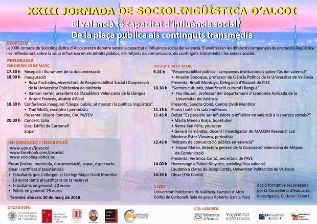 • “El valencià té capacitat d’influència social?”, aquest és el títol i el tema de la XXIII Jornada Sociolingüística d’Alcoi, que tindrà lloc els propers 23 i 24 de març. • El conjunt de les sessions ha sigut reconegut com a activitat formativa per la Conselleria d’Educació