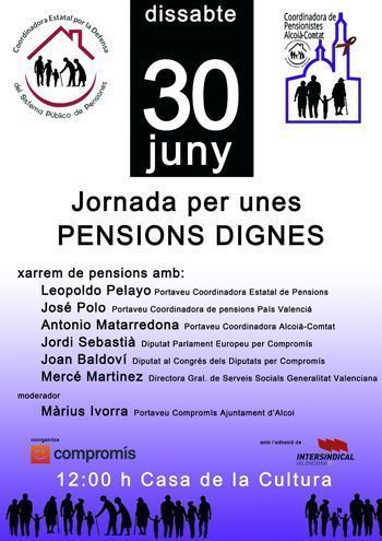 • La Coordinadora de l'Alcoià i el Comtat en defensa de les pensions públiques organitza un acte a Alcoi, junt amb Compromís Alcoi i la Intersindical Valenciana. • Serà el dissabte 30 de juny a la Casa de la Cultura, a les 12:00 horas.