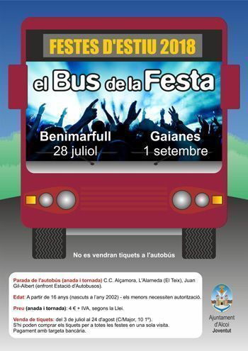 El Bus de la Festa arribarà a les festes de Benimarfull, el 28 de juliol; i les de Gaianes, l’1 de setembre. Aquest és el sext any que el bus de la festa fa realitza el seu servei, oferint la possibilitat que els joves alcoians gaudeixen de forma segura les festes de les nostres comarques