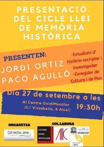 • El col·lectiu de joves de la UNESCO '12 d’agost' enceta un cicle sobre Memòria Històrica a Alcoi • L'acte inaugural tindrà lloc el 27 de setembre a les 19:30 h al Centre Ovidi Montllor, amb l’exregidor Paco Agulló i l’escriptor Jordi Ortiz