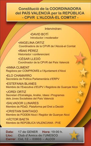 Aquest 17 de gener es constitueix la Coordinadora del País Valencià per la República de l’Alcoià-Comtat, CPVR. Es tracta d’un espai de trobada entre organitzacions, partits polítics i ciutadania de definició republicana.