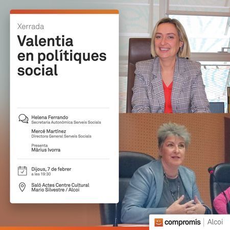 • La secretària autonòmica de Serveis Socials, Helena Ferrando, i la directora general de Serveis Socials, Mercé Martínez, estaran a Alcoi • Ambdues dones han estat implicades en el desenvolupament de polítiques i progressos socials com la Renda Valenciana i la nova Llei de Serveis Socials