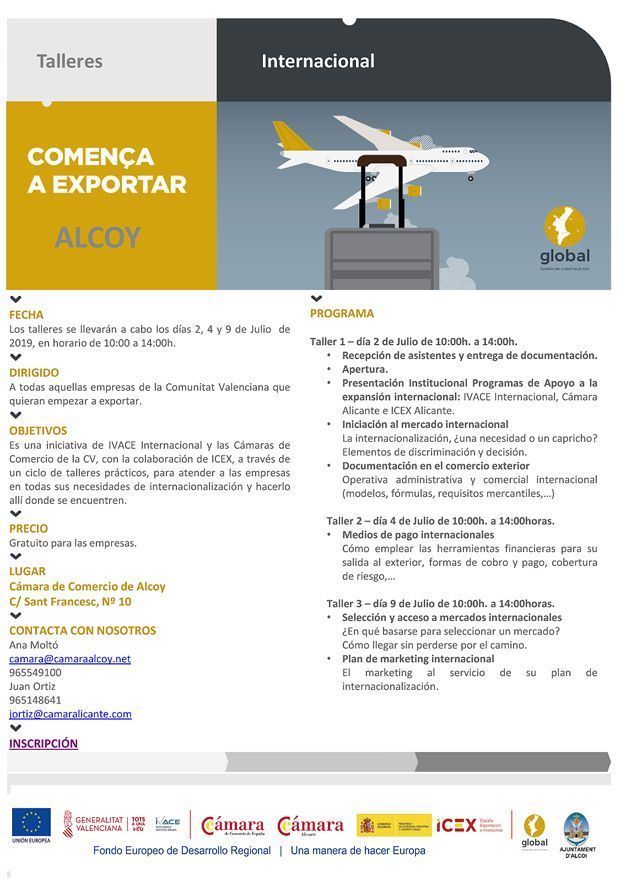 Els dies 2, 4 i 9 de juliol la seu de la Cambra de Comerç a Alcoi acull la iniciativa Comença a exportar, en horari de 10 a 14 hores