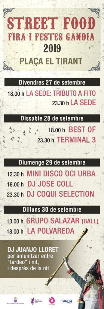 El departament de Política Festiva, organitzador de la Fira i Festes de Gandia, ha publicat el calendari d’actuacions musicals que tindran lloc del 27 al 30 de setembre a la plaça del Tirant.