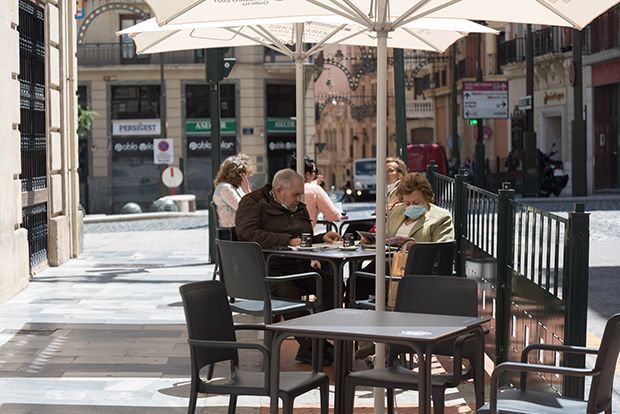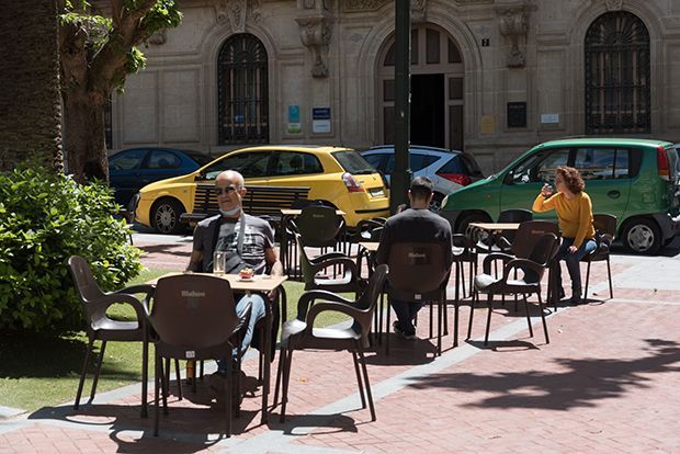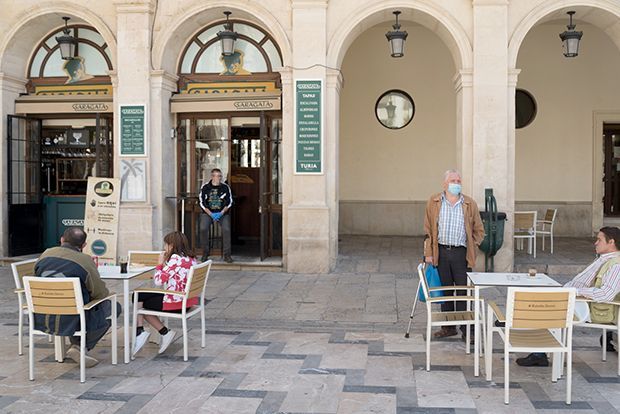 Els alcoians i alcoianes han recuperat uns espais pensats per a socialitzar, uns espais plens de felicitat, relaxació, i escenari de retrobaments a una relaxada distancia. Els cambrers, protagonistes imprescindibles, tornen a la seua feina amb professionalitat, proveïts de màscares, guants i a vegades fins i tot pantalles protectores de plàstic.