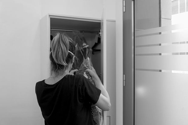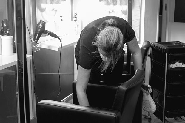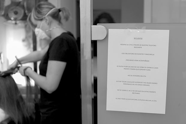 Les jaquetes i les borses es claven dins de fundes de plàstic individuals d’un sol ús. A l’hora de tallar els cabells, cada client està separat dels altres per una distància prudencial i per una mampara. A més, quan acaben la feina amb algú, desinfecten les butaques, prestatges i materials.
