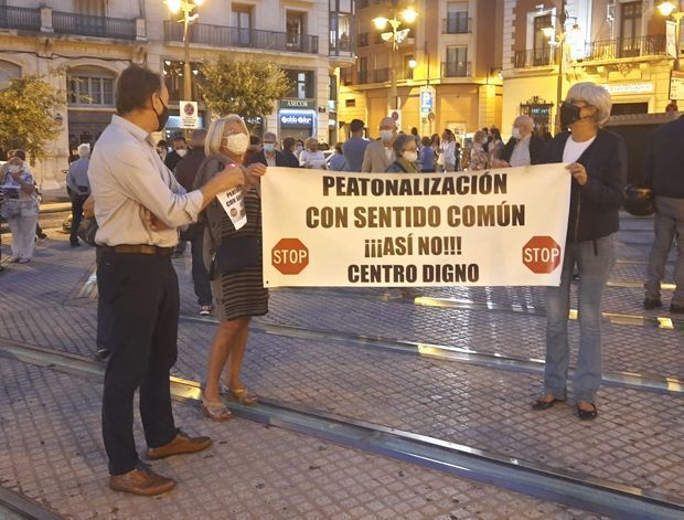 El dijous 1 d’octubre a les 8 de la vesprada es van reunir un centenar de persones aproximadament en senyal de rebuig de la conversió en zona de vianants del Centre d’Alcoi.