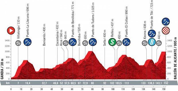 L’etapa que passarà per Alcoi als 52 km de l’eixida d’un total de 152 és considerada de muntanya en passar per 6 ports. El primer d’ells el de ‘La Llacuna’ de Primera Categoria als 16,4 km de l’eixida, de 696 metres, són 9,4 km de pujada a 6,2%. Al segon s’accedirà després del pas per la nostra ciutat, serà el de Benilloba, de Tercera Categoria amb 771 metres d’altitud, en el km 60,5 de l’etapa, 3 km de pujada al 3,5%. Seguidament arribaran al port de Tudons, de segona categoria en el punt quilomètric 80, amb una altitud de 1025 metres, té una pujada de 7,1 quilòmetres al 5,2%. El quart port de l’etapa arriba en el km 113, és el de El Collao de 890 m d’altitud, 9,5 km de pujada al 4,6%, és de segona categoria. El penúltim port serà puntuable, el de Tibi de Tercera Categoria, en el km 138,3 i una altitud de 723 metres, té 5,3 km de pujada al 5,3. L’etapa finalitzarà al Balcó d’Alacant, a 995 metres d’altitud, 8,4 km de pujada amb una mitjana del 6,2%, arribant en els trams finals al 14%.