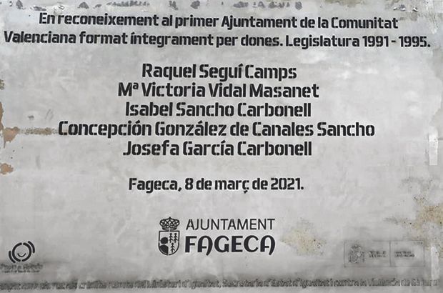 Amb ocasió del 30 aniversari de la formació d’aquest govern, i fent-ho coincidir amb la reivindicació feminista del 8 de maig, les cinc regidores de la legislatura 1991-1995 foren homenatjades enguany al seu poble. El govern municipal de Fageca va organitzar un acte amb les protagonistes, durant el qual es va descobrir una placa commemorativa a la façana de la casa consistorial. La placa immortalitza el nom de les cinc edils, fent constar a més el caràcter pioner del seu govern. L’acte va comptar amb la presència de Raquel Seguí, Isabel Sancho i Josefa García, així com de les filles de María Victoria Vidal -que va faltar l’any passat- juntament amb l’actual alcalde, i nombrosos veïns. Durant el descobriment de la placa també es va realitzar una exposició amb fotos i reculls de premsa de l’època que feien constar els resultats electorals.
