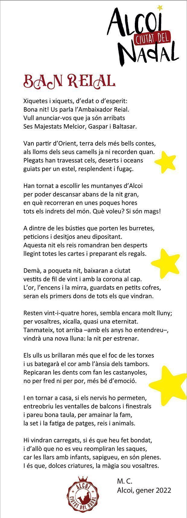 Com és tradició a Alcoi, en la vesprada del dia 4 de gener, els xiquets, xiquetes, però també els més majors, entreguen la seua carta amb els seus desitjos per als Reis Mags. Enguany ja s’ha pogut tornar a celebrar aquest acte, que durant l’any passat es va haver de suspendre a causa de la pandèmia.