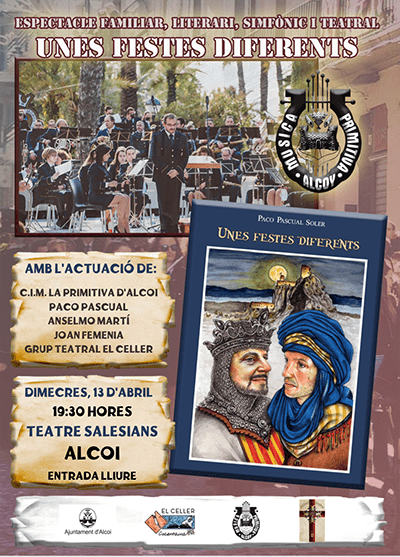 Paco Pascual presenta un nou llibre. Unes festes diferents. Serà el 13 d’abril, a les 19:30 h, al teatre Salesians d’Alcoi. Entrada lliure a un espectacle amb la música de La Primitiva d’Alcoi i les cançons d’Anselmo Martí i Joan Femenia, a més del teatre del grup El Celler.