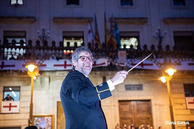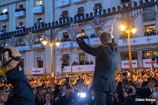 Les esperades festes alcoianes arriben a través de grans imatges: El poble alcoià entona il·lusionat l’Himne de festes a l’uníson entre els milers de persones presents a la plaça d’Alcoi ha produït un efecte màgic. Àngel Lluís Ferrando ha sigut la persona encarregada de dirigir l’Himne, acompanyat del Sant Jordiet Fernando Rius.
