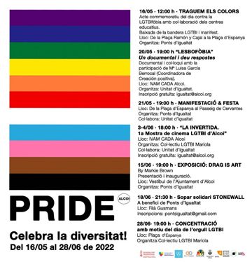 Alcoi es prepara per a celebrar la diversitat i la igualtat de les persones, i per això, des de la regidoria d’Igualtat, juntament amb els col·lectius Ponts d’Igualtat i LGTBI MARIola, s’ha organitzat una programació per celebrar l’orgull.