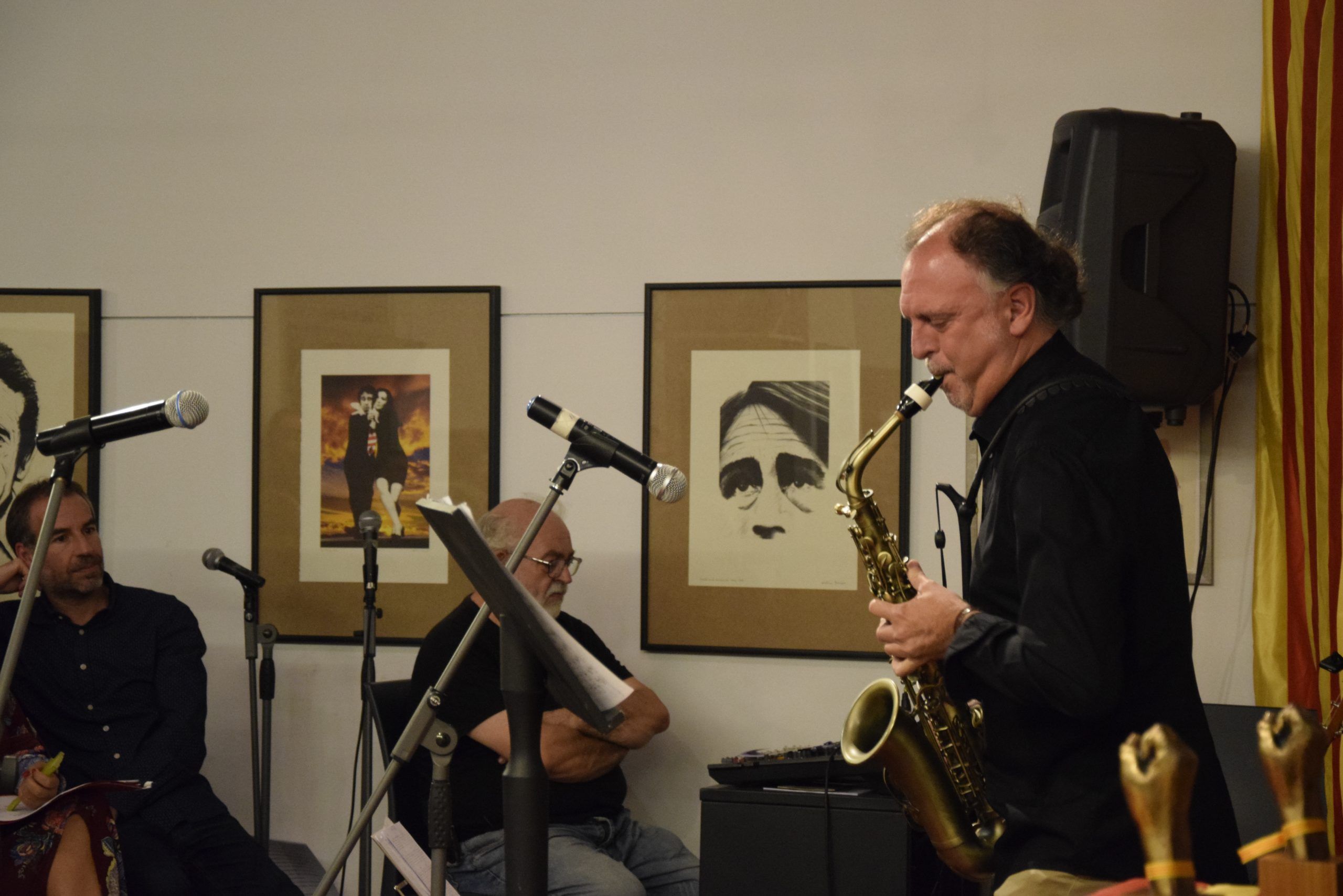 De nou la música va sonar a la sala amb un personal ‘cover’ de la cançó emblemàtica composta per Ovidi Montllor, “Homenatge a Teresa” que van interpretar i compondre per la nit dels Palmells Jacobo Blanes, guitarra, Rafa Sempere, Clarinet, i Juan Mateo, guitarra.