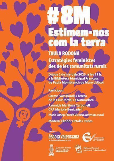 En aquest sentit, l’entitat ha coorganitzat, amb l’Ajuntament de Muro d’Alcoi, i la col·laboració de la Coordinadora Alcoià-Comtat per la llengua, la taula redona Estratègies ecofeministes des de les comunitats rurals, que tindrà lloc demà, dijous 2 de març, a les 19.00 hores, a la biblioteca Francesc de Paula Momblanch de Muro a la comarca del Comtat. hi participaran Carme Ivars Ronda i Teresa de la Cruz Jordà, de la Naturadora, la directora del CRA Mariola-Benicadell, Azoraida Martínez Carbonell, i l’activista rural Maria Josep Fracés Vicario, per tal de compartir els reptes i les oportunitats que plantegen la igualtat i la sostenibilitat a les zones rurals des d’experiències educatives, l’economia social i l’activisme.