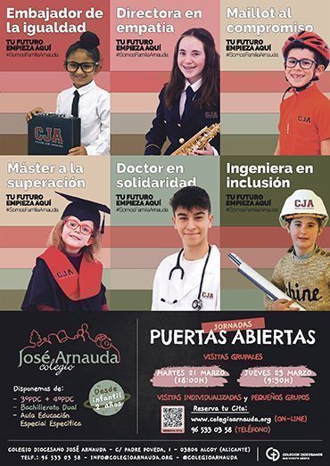 Quan arriba el moment d’encarar la recta final del curs, els col·legis es preparen per al pròxim, i el primer pas és realitzar les jornades de portes obertes, perquè pares i famílies puguen conéixer com es treballa, les instal·lacions, i a alguns membres de l’equip docent. El Col·legi José Arnauda celebrarà aquestes jornades a partir del mes març. D’una banda, hi haurà dos dies per a fer visites grupals. El primer dia serà el dimarts 21 de març, a les 18h; i també, es podrà visitar el centre el dijous 23 de març, a les 9:30h. En aquest segon dia programat per a rebre a pares i mares, els assistents podran conéixer de primera mà com es treballa, ja que l’alumnat estarà a les aules.