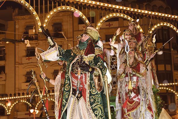 La vesprada va començar amb la capitania de la Filà Ligeros, que va eixir-se de les històries tradicionals sobre Al-Azraq, i va parlar sobre la màgia. L’estètica ligera va estar present en tot moment, inclòs el trage del Capità, Salvador Micó, que va lluir un disseny on predominaven els colors ligeros, i el cavall, molt present durant tot el càrrec. L’esquadra especial, en negres i daurats, va mostrar-nos a la figura d’uns guerrers sumeris, encarregats de recaptar els impostos.