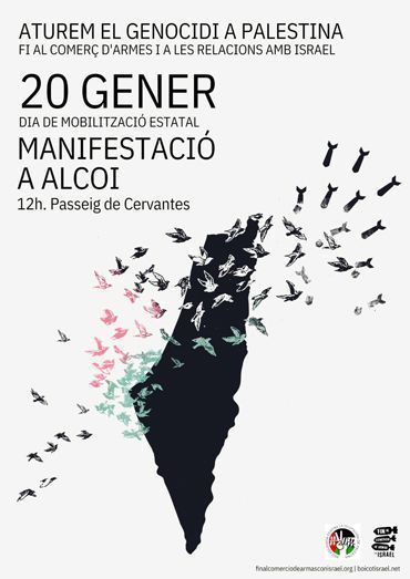 El dissabte 20 de gener està convocada una mobilització estatal sota el nom de ‘Aturem el genocidi a Palestina. Fi al comerç d’armes i a les relacions amb Israel’, i que també tindrà seguiment a Alcoi. Aquesta mobilització està organitzada per la Red Solidaria Contra la Ocupación de Palestina.