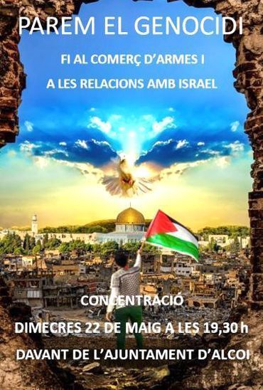Per tal de donar suport a Palestina, el dimecres 22 de maig de 2024 s’ha convocat una concertació, que tindrà lloc a les 19:30h davant de l’Ajuntament d’Alcoi.