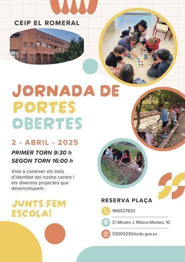 En pocs mesos finalitzarà aquest curs, i molts pares i mares ja estan pensant a quin centre educatiu portaran a les seues filles o fills per al pròxim que començarà a setembre. Des del CEIP El Romeral, animen a les famílies a visitar el seu centre a les seues jornades de portes obertes que se celebraran el dia 2 d’abril, en dos torns, a les 9:30h i a la vesprada, a les 16:00h.