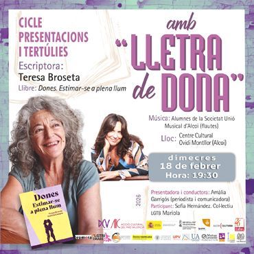 El Centre Cultural Ovidi Montllor serà l’escenari, una vegada més, del cicle de presentacions i tertúlies ‘Lletra de dona’. Serà el dia 18 de febrer, a les 19:30h, en un acte que estarà presentat per la periodista alcoiana Amàlia Garrigós, on es parlarà del llibre ‘Dones. Estimar-se a plena llum’, amb l’autora, Teresa Broseta.