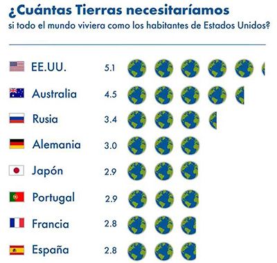 Segons càlculs de la Global Footprint Network, una organització internacional d’investigació respecte a petjada ecològica i biocapacitat el 23 de maig de 2025 és la data en la qual Espanya ha arribat al seu dia de sobrecapacitat. Això vol dir que, si tots els habitants del món tingueren els índexs de producció i consum del nostre país, en este dia s’haurien esgotat tots els recursos que el planeta és capaç de disposar i regenerar en un any. Vist d’una altra manera, per a mantindre la nostra vida actual cada any ens fan falta els recursos de 2 planetes i mig.
